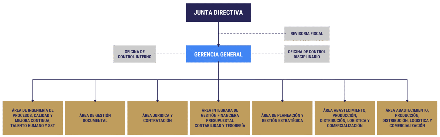 La estructura organizacional de la entidad está encabezada por la Junta Directiva, como máximo órgano de dirección, y la Gerencia General, responsable de orientar la gestión estratégica, administrativa y operativa de la empresa, asegurando el cumplimiento de los objetivos misionales.